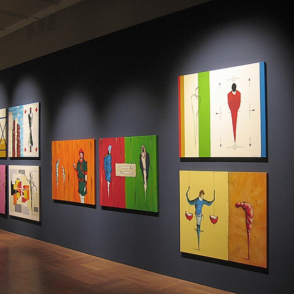 Jedem der Bilder gingen zahlreiche Skizzen voraus, in denen Heinz Felbermair den Persönlichkeiten hinsichtlich Haltung und Gestik im Kontext des jeweiligen Bildraumes nachspürt. Die Gestaltung und schlaglichtartige Modellierung lässt an Bauhaus-Figurinen, wie die „Tänzerin“ von Oskar Schlemmer, denken. In pantomimischem Spiel agieren die Figuren in weiten, bühnenartigen Bildräumen. Der ikonographischen Vielfalt sind dabei keine Grenzen gesetzt. So erscheinen ihre Silhouetten mal als scharf modellierte Kokons auf spindelartigen Stelzen, mal als humorvolle Gliederpuppen oder als kräftige, muskulöse Schattenfiguren, die mit ihren Attributen spielen. Die Darstellungen der modernen Titanen sind so vielfältig wie ihre Lebenswege selbst.