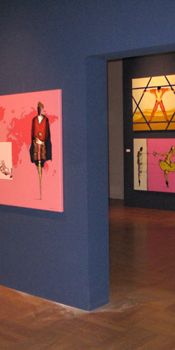 Die „40 Titans“ sind inhaltlich und kompositorisch paarweise aufeinander bezogen, sei es als Partner oder als kontrastreiche Gegenspieler. Die beiden Ältesten unter den modernen Titanen stehen am Anfang der Ausstellung. Sie markieren den Aufbruch in die Neuzeit, dennoch können ihre Biografien kaum unterschiedlicher sein. Jakob.... (1459-1525) war seinerzeit der bedeutendste Kaufmann und Bankier in Europa. Aufrecht und stark wird er als Vertreter einer frühen Globalisierung vor der Weltkarte präsentiert. Neben ihm Ignatius....... (1491-1556), dessen tänzerisch ausponderierte Gestalt im Brustharnisch den Lebenswandel vom adligen Ritter zum Begründer des Jesuitenordens versinnbildlicht.
