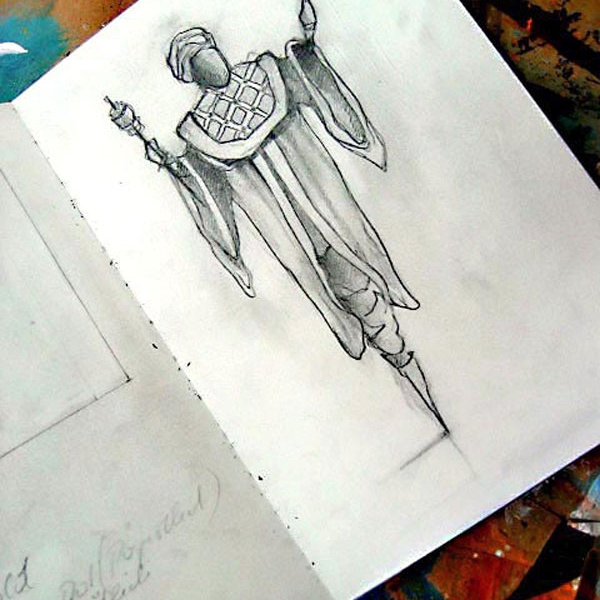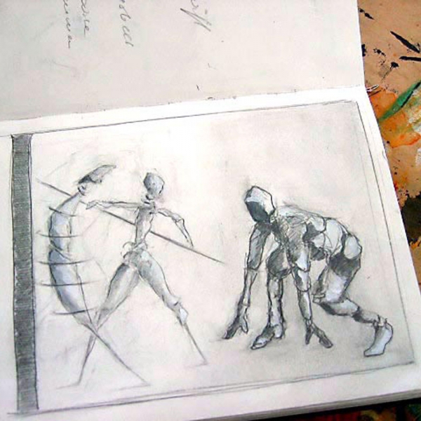 Jedem der Bilder gingen zahlreiche Skizzen voraus, in denen Heinz Felbermair den Persönlichkeiten hinsichtlich Haltung und Gestik im Kontext des jeweiligen Bildraumes nachspürt.