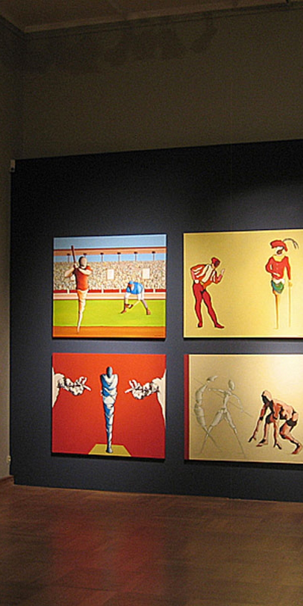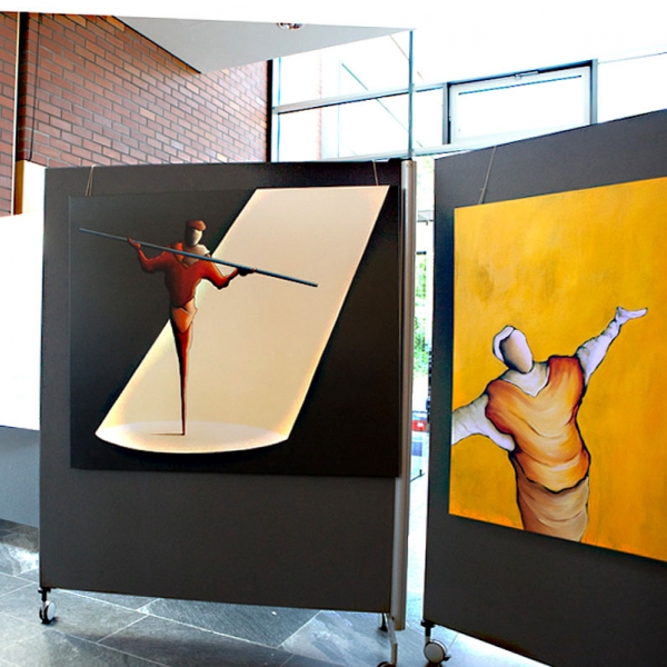 Jedem der Bilder gingen zahlreiche Skizzen voraus, in denen Heinz Felbermair den Persönlichkeiten hinsichtlich Haltung und Gestik im Kontext des jeweiligen Bildraumes nachspürt. Die Gestaltung und schlaglichtartige Modellierung lässt an Bauhaus-Figurinen, wie die „Tänzerin“ von Oskar Schlemmer, denken. In pantomimischem Spiel agieren die Figuren in weiten, bühnenartigen Bildräumen. Der ikonographischen Vielfalt sind dabei keine Grenzen gesetzt. So erscheinen ihre Silhouetten mal als scharf modellierte Kokons auf spindelartigen Stelzen, mal als humorvolle Gliederpuppen oder als kräftige, muskulöse Schattenfiguren, die mit ihren Attributen spielen. Die Darstellungen der modernen Titanen sind so vielfältig wie ihre Lebenswege selbst.