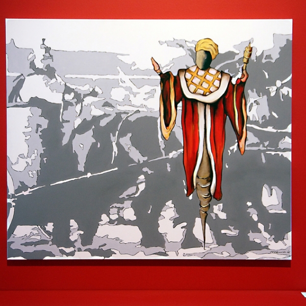 Die „40 Titans“ sind inhaltlich und kompositorisch paarweise aufeinander bezogen, sei es als Partner oder als kontrastreiche Gegenspieler. Die beiden Ältesten unter den modernen Titanen stehen am Anfang der Ausstellung. Sie markieren den Aufbruch in die Neuzeit, dennoch können ihre Biografien kaum unterschiedlicher sein. Jakob.... (1459-1525) war seinerzeit der bedeutendste Kaufmann und Bankier in Europa. Aufrecht und stark wird er als Vertreter einer frühen Globalisierung vor der Weltkarte präsentiert. Neben ihm Ignatius....... (1491-1556), dessen tänzerisch ausponderierte Gestalt im Brustharnisch den Lebenswandel vom adligen Ritter zum Begründer des Jesuitenordens versinnbildlicht.